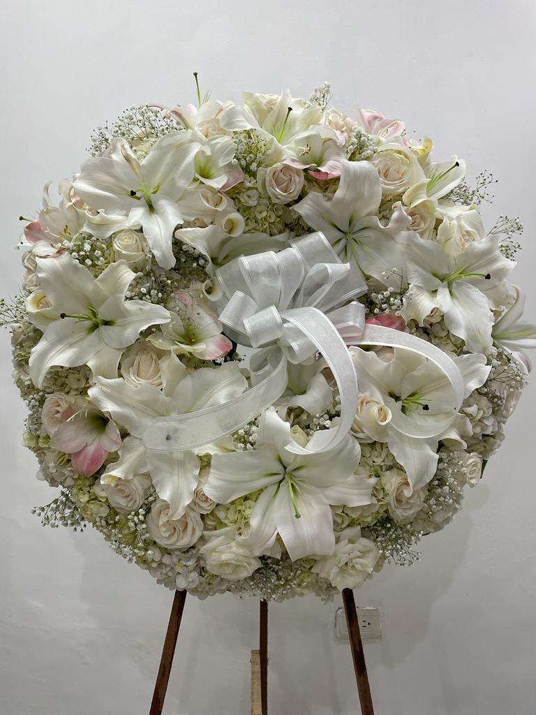 Esta corona fúnebre de rosas y lirios blancos simboliza paz, respeto y homenaje para despedir a un ser querido. Su diseño elegante y armonioso transmite condolencias con un mensaje de amor eterno. Disponible con entrega en funerarias y domicilios en Pereira.